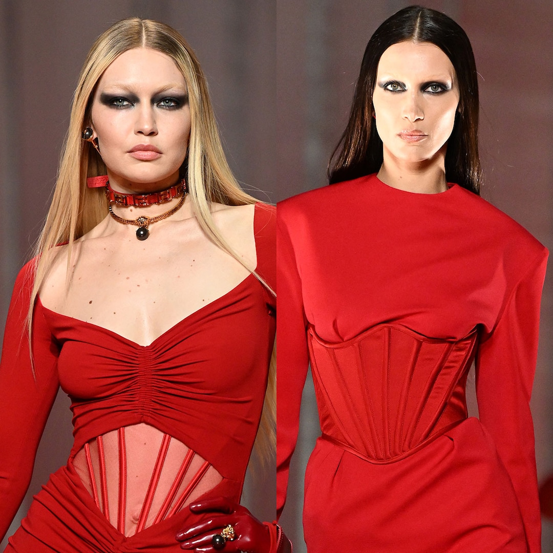 While working the runway in red hot ensembles from the Italian fashion house’s latest collection, the supermodel sisters—and Dontella Versace‘s latest muses—were twinning with their dramatic beauty looks. Along with straight waist-length hair and edgy smoky eyes, Bella, 25 and Gigi, 26—who welcomed daughter Khai with ex Zayn Malik in September 2020— showed off newly bleached eyebrows.